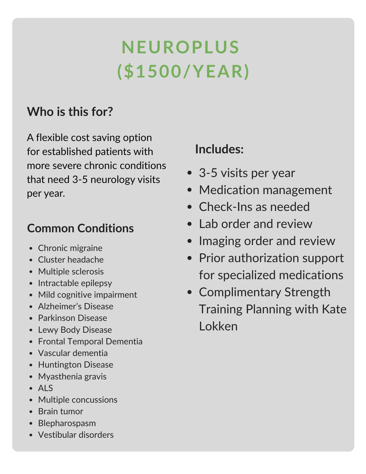Beginning January 1, 2026, Roaring Fork Neurology has adopted a direct pay billing model, with the exception of traditional Medicare and Medicaid - which we will continue to bill and accept as full payment. This means transparent pricing for you, due at the time of your visit. We will continue to bill and accept Medicare payments for traditional Medicare and Medicaid in combination with any secondary insurances associated with your Medicare plan. However, we no longer accept Medicare Advantage. While we will no longer bill private insurance, we can provide you with a superbill and receipt so that you can submit directly for out-of-network reimbursement or credit towards your private insurance deductible. You can choose to pay by visit or take advantage of NeuroEssentials or NeuroPlus bundled plans below which offer an elevated value. We also offer a sliding scale rate of 50% off for anyone with a household income of <$75,000 from the prior tax year. If you wish to be considered for the sliding scale pricing, please send a copy of the prior year’s tax return to info@rfneurology.com.