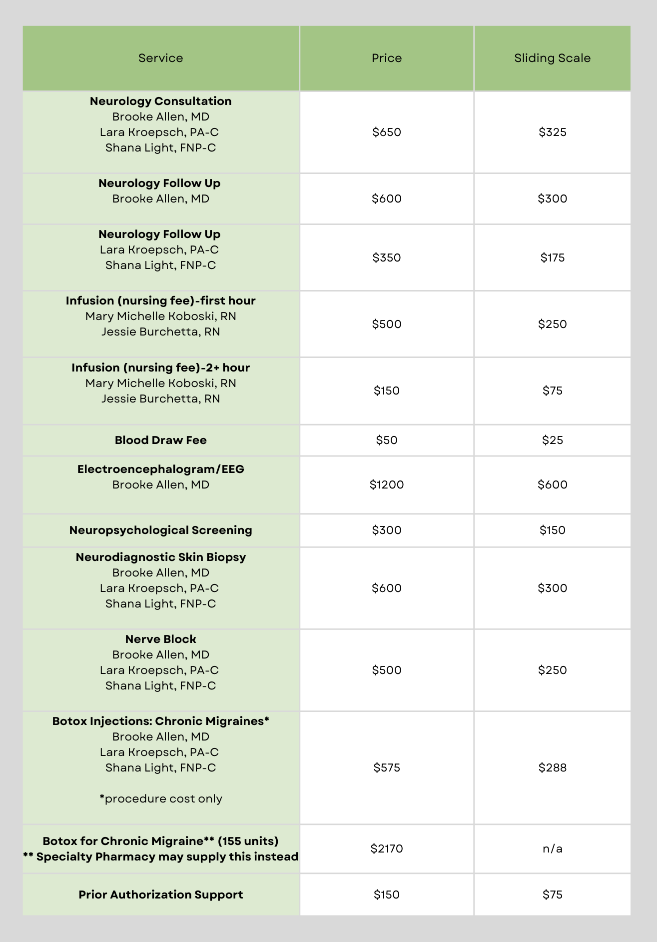 Offer transparent pricing and flexible options, including a sliding scale. If you would like to sign up for our sliding scale, please email us info@rfneurology.com. We require a past year tax return showing < $75K annual household income.